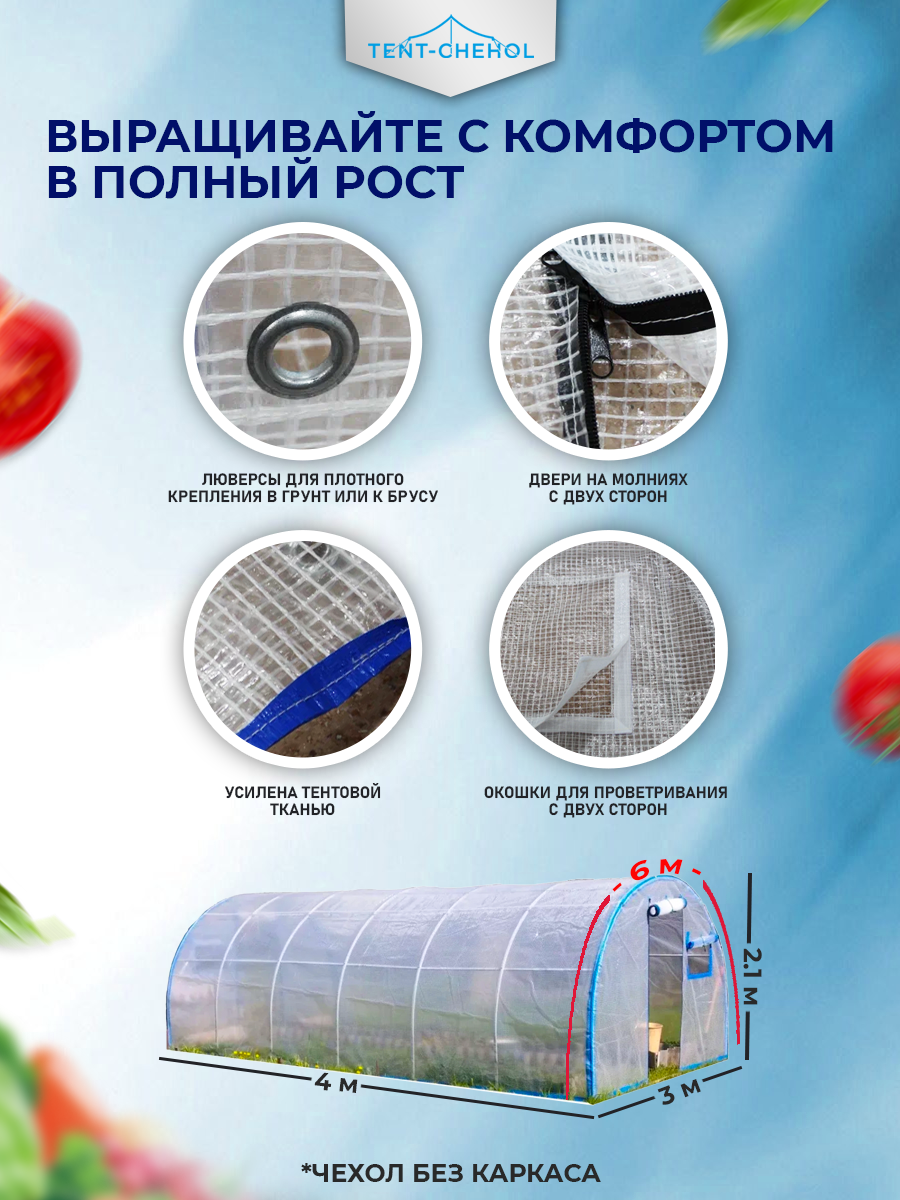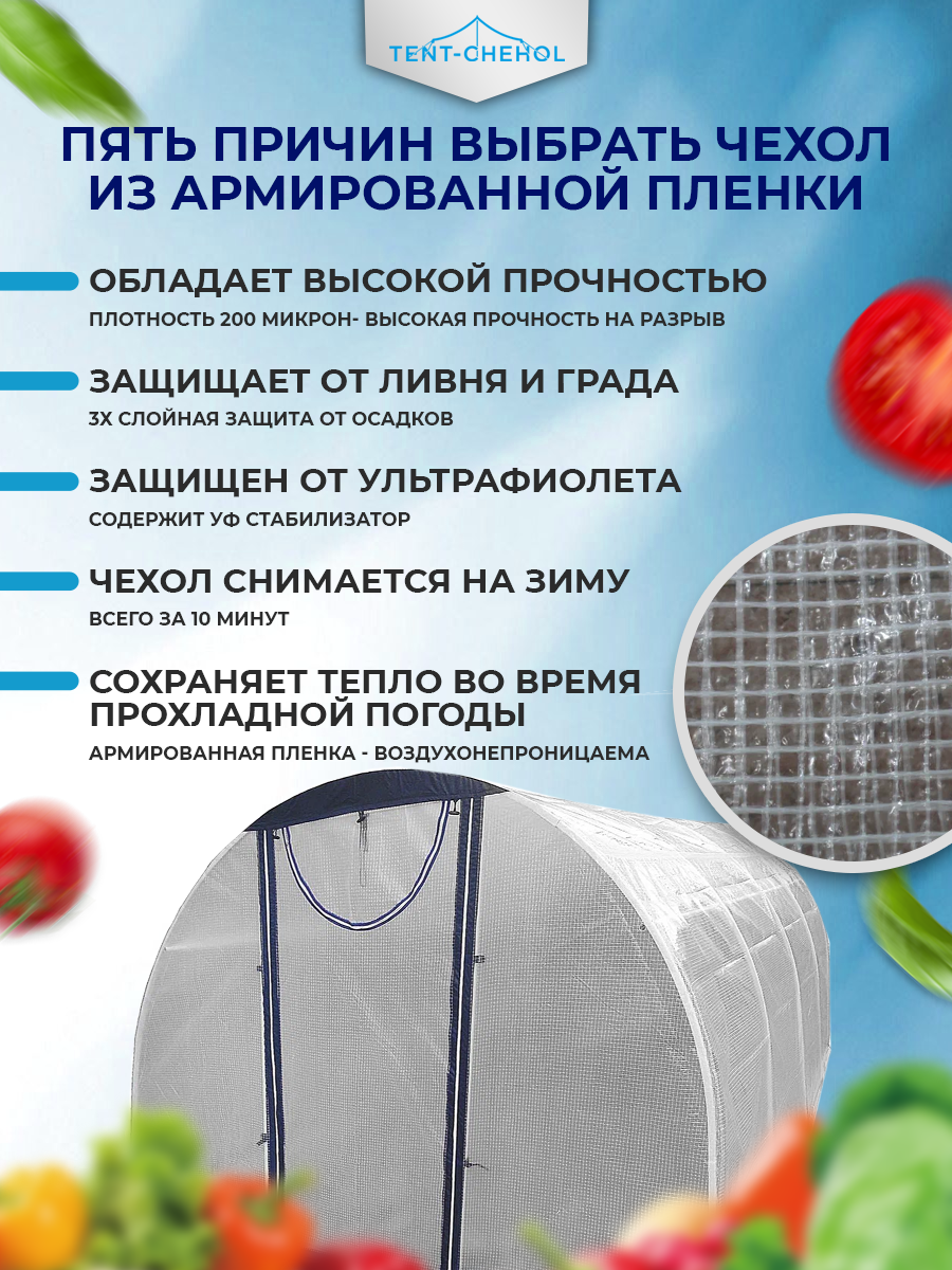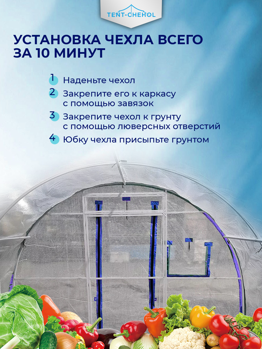 Чехол для теплицы из армированной пленки толщиной 200 мкм с боковым проветриванием, который с легкостью одевается на каркас любой теплицы и парника. Только чехол ферма снабжён специальными  усиленными стропами( более 25 точек крепления) для фиксации к каркасу, его точно не растрепит ветер и уж точно не улетит к соседям. Чехол на каркас ферма отлично заменяет поликарбонат, а зимой складывается за 15 минут в специальную сумку.