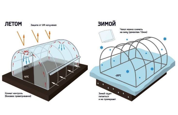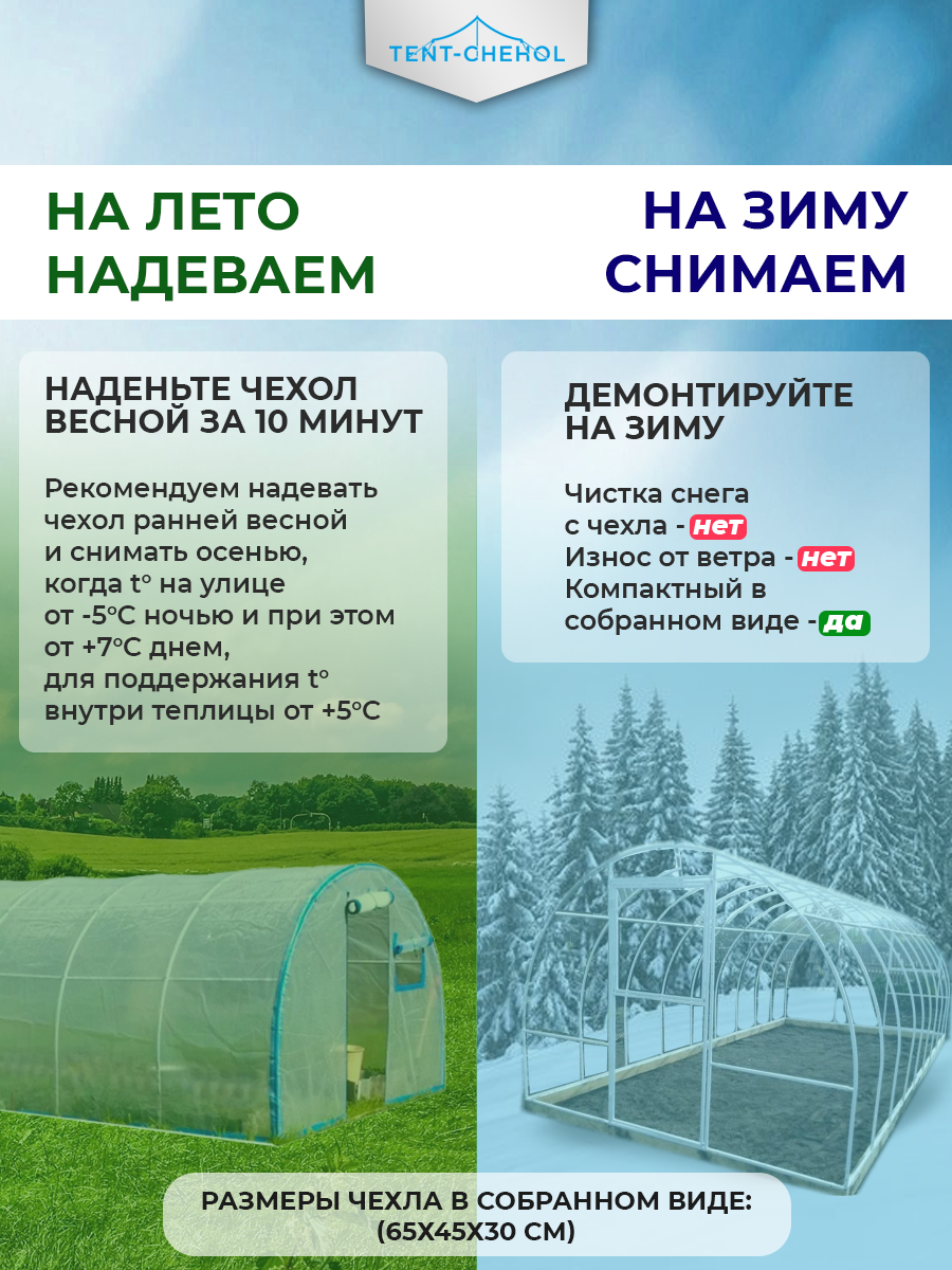 Срок службы чехла увеличивается( 4-7 лет), а снег не портит конструкцию , питает грунт и исключает вымерзания почвы. Есть возможность нижнего бокового проветривания, которое также обеспечивает доступность к грядам со всех сторон. Чехол на парник это отличный подарок любому дачнику