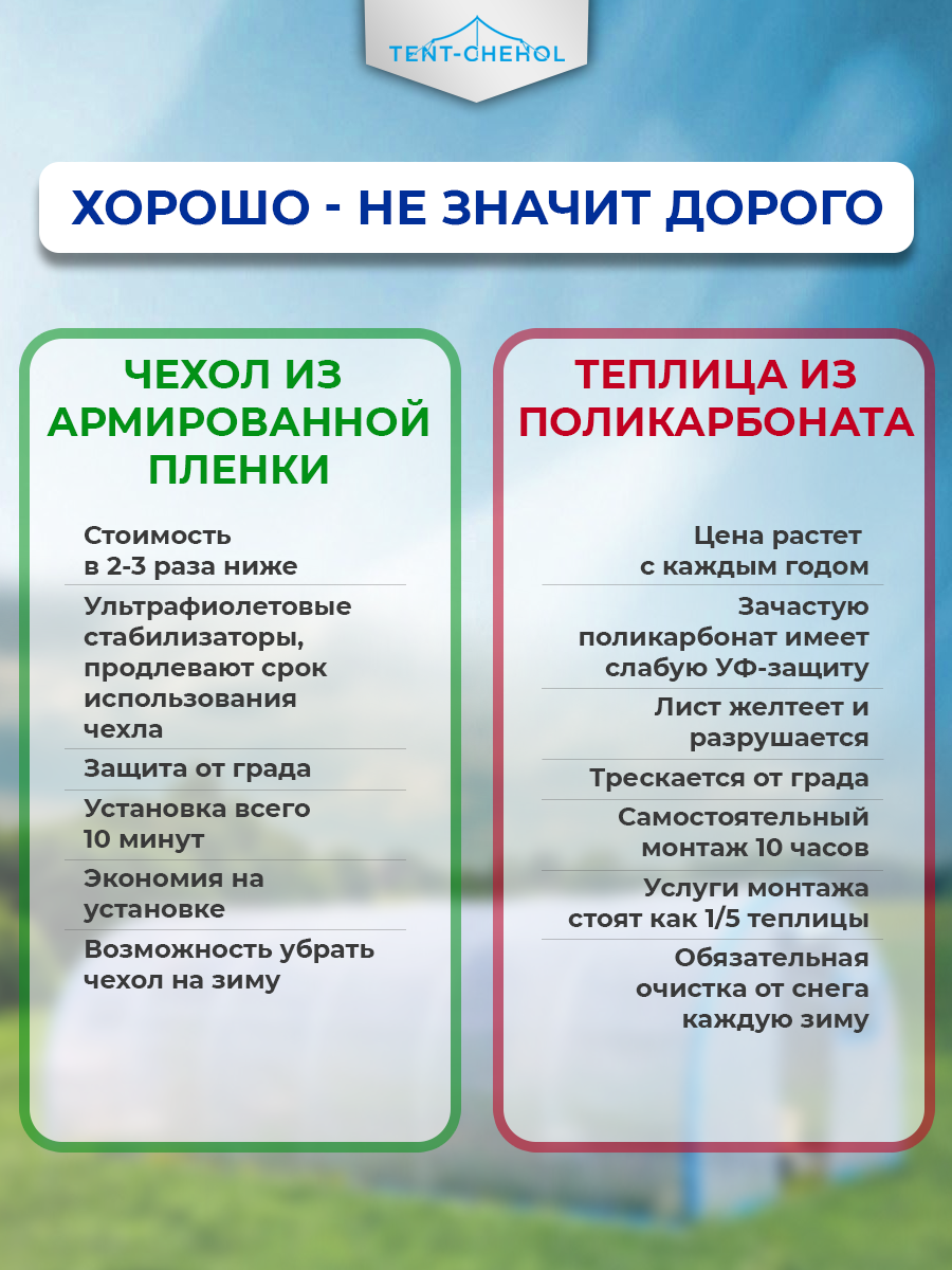 усиленными стропами( более 25 точек крепления) для фиксации к каркасу, его точно не растрепит ветер и уж точно не улетит к соседям. Чехол на каркас ферма отлично заменяет поликарбонат, а зимой складывается за 15 минут в специальную сумку.
