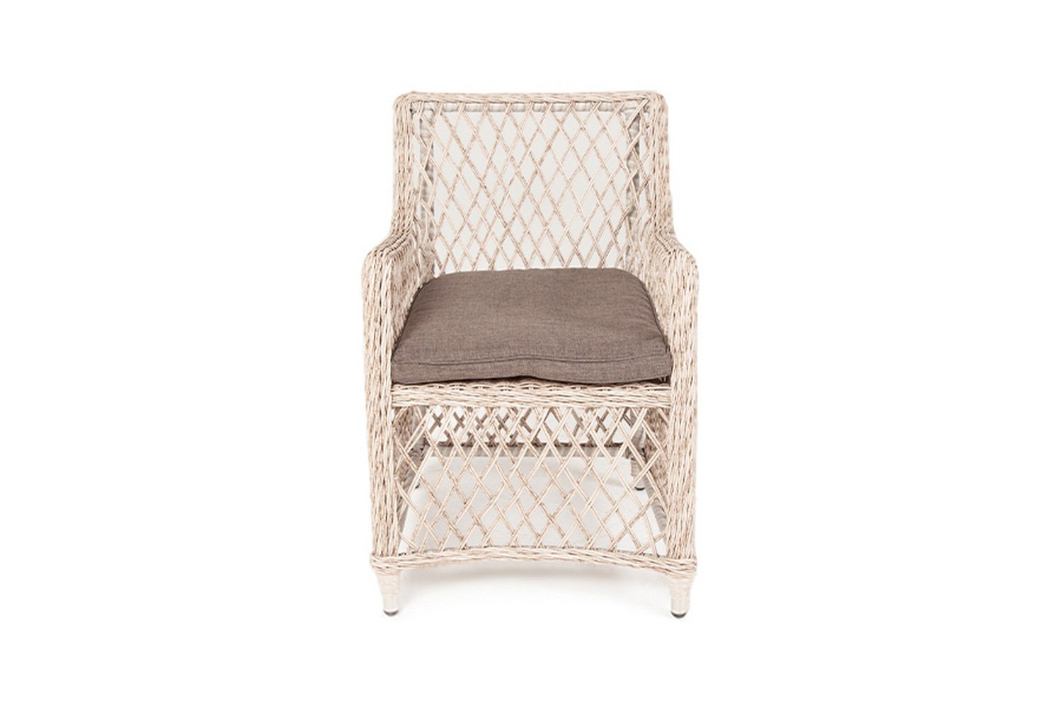 Кресло коллекции 4SiS Латте – это нежное, почти воздушное на вид кресло в приятных постельных тонах. Несмотря на свой мягкий вид – это прочный и практичный элемент мебели, предназначенный для установки на улице в летние и зимние периоды. Каркас кресла состоит из алюминия, каркас покрыт оплеткой искусственного ротанга бежевого цвета. Оплетка выполнена неплотным переплетением, что и придает визуальную легкость креслу. На самом деле, кресло достаточно легкое для легкой переноски его в любое место сада, но при этом оно достаточно прочное и устойчивое, чтобы выдерживать нагрузку до 150 градусов. Размер кресла всего 55х84х68 см – достаточно небольшое, но комфортное кресло.