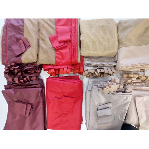 При оформлении заказа можно выбрать вид креплений – люверсы или липучки. Все шторы между собой могут быть соединены с помощью молнии. В комплекте товара присутствует 6 москитных штор, булавки и подвязки для крепления к беседке. При оформлении заказа можно выбрать разную толщину окантовки (от 210 до 600 ден), но это повлияет на цену.